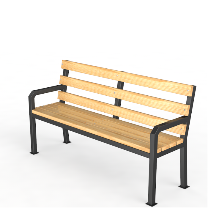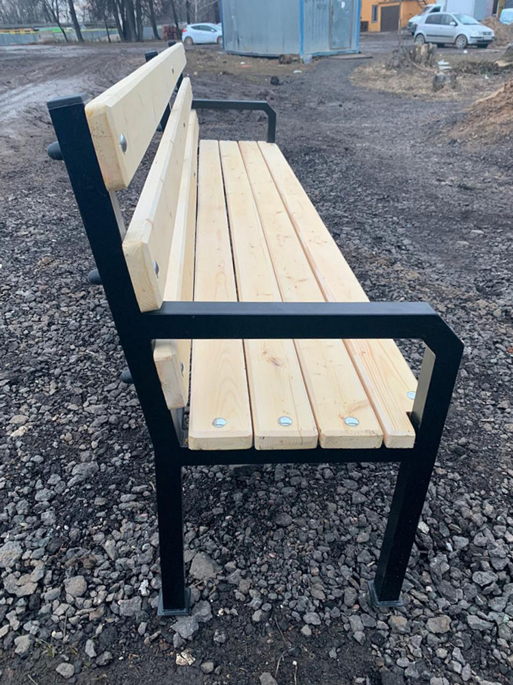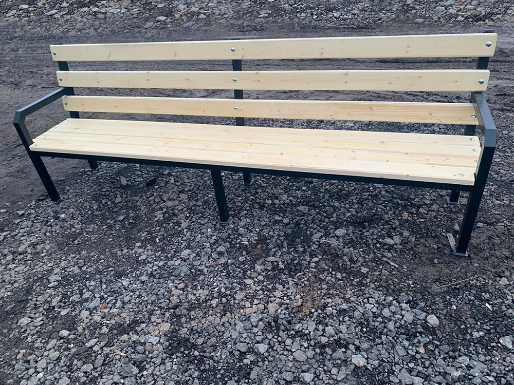 Уличная скамейка со спинкой Дача выполнена из 7 сосновых брусков размером 2000х100х40 мм, покрытых атмосфероустойчивой пропиткой на цельносварном металлическом каркасе на 4 опорах.