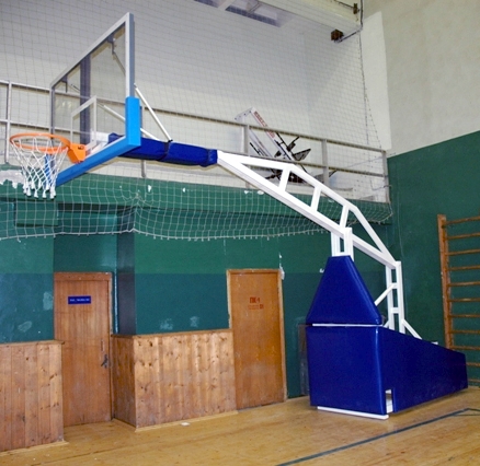 В стандартном комплекте: стойка баскетбольная складная (гидравлический механизм складывания) на колесах, противовесы, комплект фиксации к полу, протекторы основания стойки, щит баскетбольный 1800х1050 мм поликарбонат 10 мм на металлической раме с протектором (или закаленное стекло 10 мм), протектор "шейной" части стойки, кольцо амортизирующее, сетка. Конструктивно эта баскетбольная стойка выполнена по чертежам SCHELDE SPORTS (аналог SUPER SAM 325)