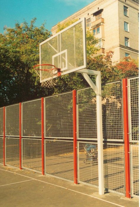 Стойка баскетбольная стационарная уличная имеет вынос 1,2 м. Предназначена для установки на открытых уличных игровых площадках, баскетбольная стойка может быть укомплектована любым игровым или тренировочным баскетбольным щитом по выбору заказчика (из фанеры, металла или оргстекла на металлической раме), дополнительно также понадобится баскетбольное кольцо (жесткое, амортизационное, усиленное или антивандальное) и сетка.