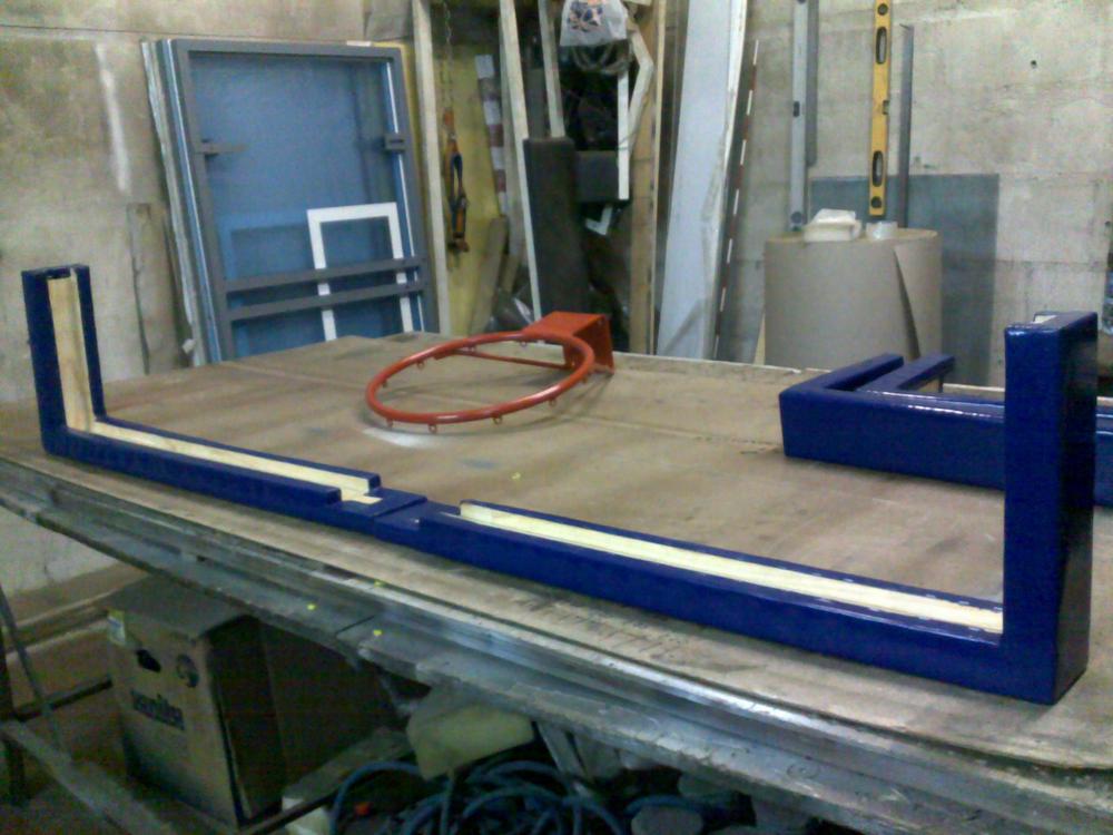 Изготавливается на фанерном или ДВП каркасе, наполнитель поролон в чехле из тентовой ткани, стандартно изготавливается синего цвета и крепится на нижнюю часть щита на саморезах.