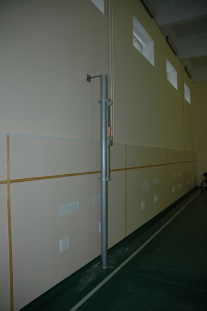 Высота механизма натяжения регулируется и позволяет использовать стойки для игры в волейбол (мужской, женский, юношеский), бадминтон и теннис. Одним концом фиксируются в пол, другой конец снабжен кронштейном и крепится к стене. По желанию заказчика можно изготовить стойки волейбольные пристеночные с любым выносом от стены, это часто бывает необходимо, если в том месте, где необходимо установить волейбольные стойки пристенные, находятся батареи отопления, подоконники или трубы.